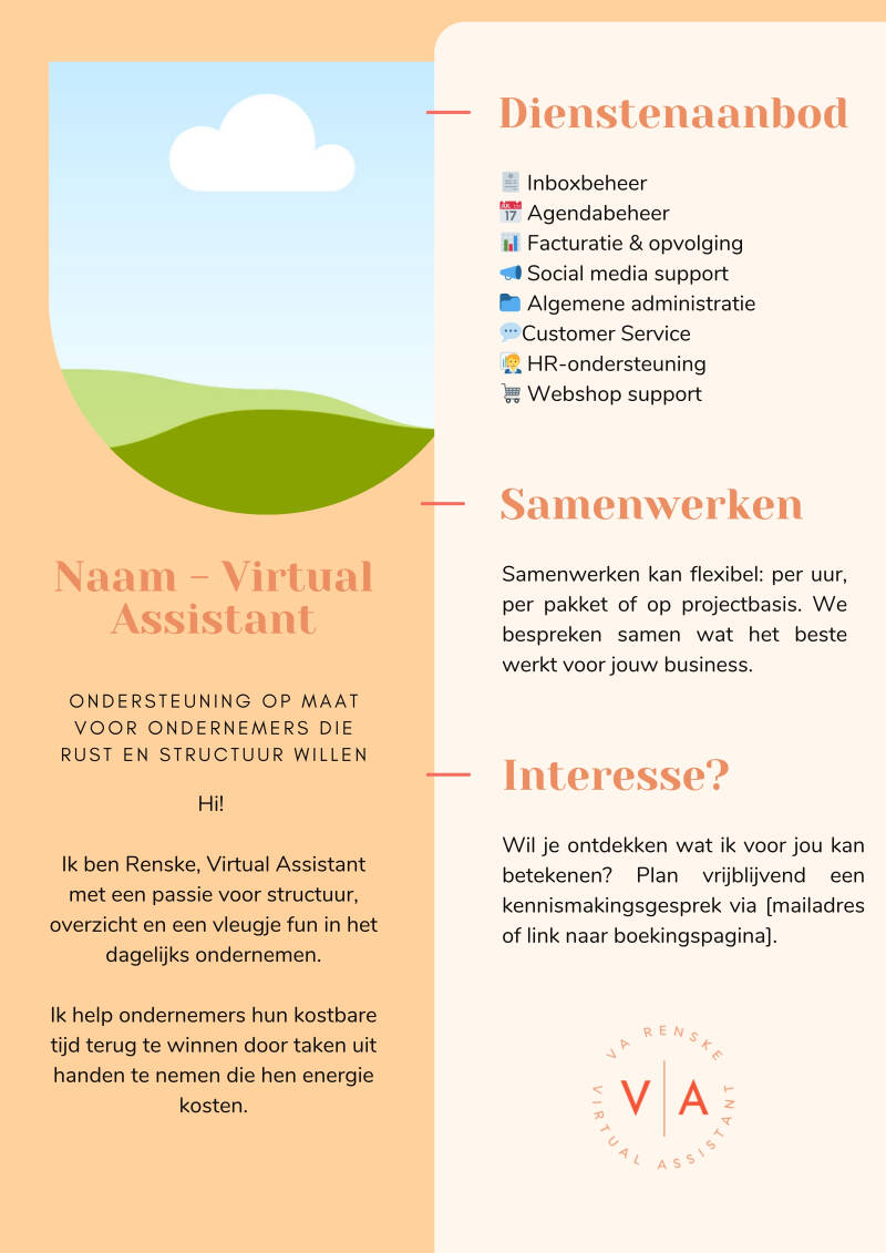 Kortom: deze starterkit helpt je om met zelfvertrouwen in actie te komen, zodat je jezelf als VA professioneel kan presenteren — zónder alles zelf uit te moeten zoeken.